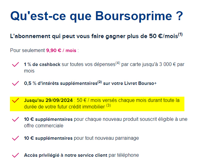 Boursoprime est un abonnement payant à 9.90 € par mois proposé par Bourobank. Cet abonnement donne accès à quelques avantages (cf taux boosté livret Bourso+), dont celui d’obtenir une prime de 50 euros versée mensuellement en cas de souscription d’un crédit immobilier commercialisé par Boursobank. Certains meprunteurs ont inclus cette promotion de 40 euros (50 - 9.90, soit 40.10 euros) dans leurs calculs afin de comparer les offres bancaires. Mais voilà, les taux promotionnels par définition ne doivent pas durer. Ainsi pour Boursobank, la distribution de crédits immobiliers reste difficile. Afin de ne pas induire en erreur les emprunteurs, considérant cette prime de 50 euros versée tous les mois en cas de souscription d’un crédit Société Générale, Boursobank prévient à l’avance : cette promotion se termine à fin septembre 2024. Il est donc inutile de compter dessus pour les nouveaux dossiers non signés avant septembre.