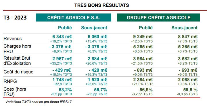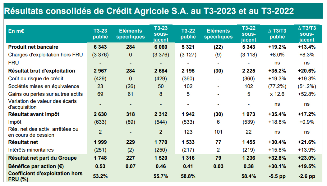 Le résultat avant impôt sous-jacent s’établit à 2 961 millions d’euros, en hausse de +6,0% par rapport au troisième trimestre 2022. Le résultat avant impôt sous-jacent intègre la contribution des sociétés mises en équivalence pour 63 millions d’euros (en baisse de -43,0%, notamment expliqué par la consolidation ligne à ligne de CA Auto Bank) ainsi que le résultat net sur autres actifs qui atteint 9 millions d’euros ce trimestre. La charge d’impôt sous-jacente est en baisse de -7,0% sur la période. Le résultat net sous-jacent avant déduction des minoritaires est en hausse de +9,7% pour s’établir à 2 272 millions d’euros. Les intérêts minoritaires augmentent de +13,5%. Enfin, le résultat net part du Groupe sous-jacent s’établit à 2 068 millions d’euros, en hausse de +9,3% par rapport au troisième trimestre 2022.