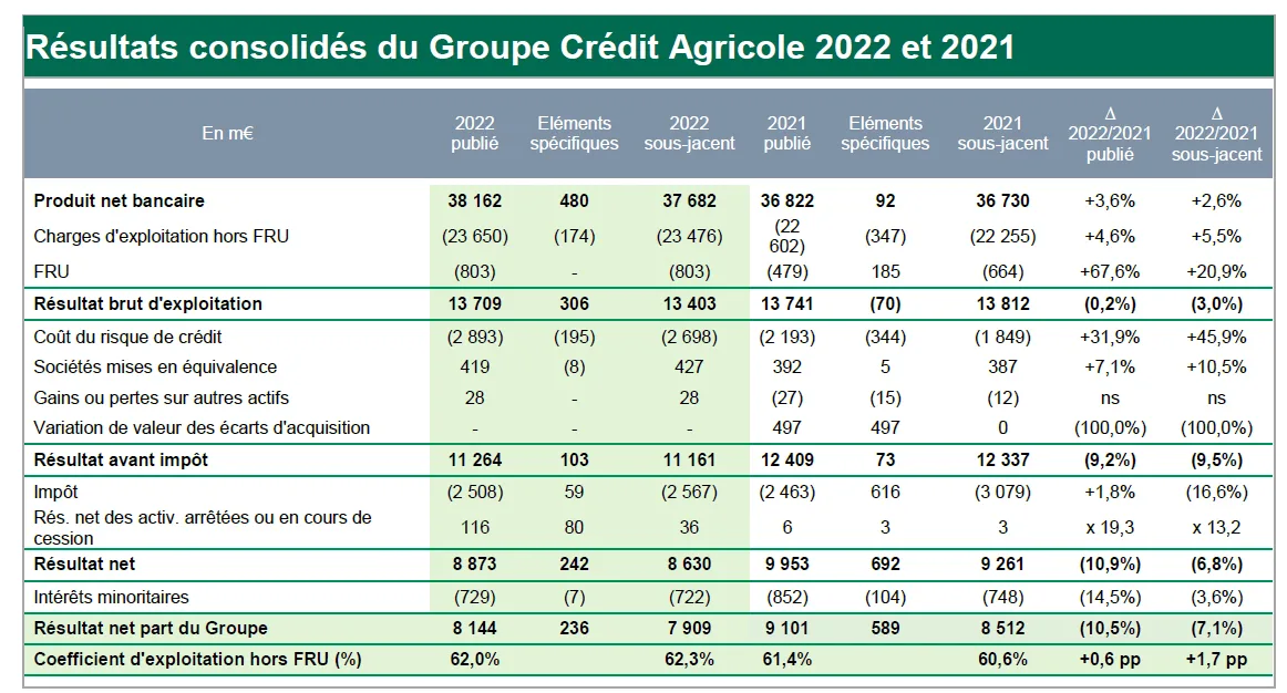 Résultats Crédit Agricole en baisse : Sur l’ensemble de l’année 2022, le résultat net part du Groupe publié est de 8 144 millions d’euros, contre 9 101 millions d’euros pour l’année 2021, soit une baisse de -10,5%. Pour mémoire, l’année 2021 est caractérisée par un effet de base sur le résultat net part du groupe, celui-ci intégrant en effet +473 millions d’euros au titre du badwill et du DTA hors bilan de Creval17. Hors cet effet, la baisse du résultat net part du Groupe publié serait limitée à -5,6%. Les éléments spécifiques de l’année 2022 comprennent les éléments spécifiques des Caisses régionales sur l’année 2022 détaillés dans la section Caisses régionales et les éléments spécifiques de Crédit Agricole S.A. sur l’année 2022, détaillés dans la section Crédit Agricole S.A.