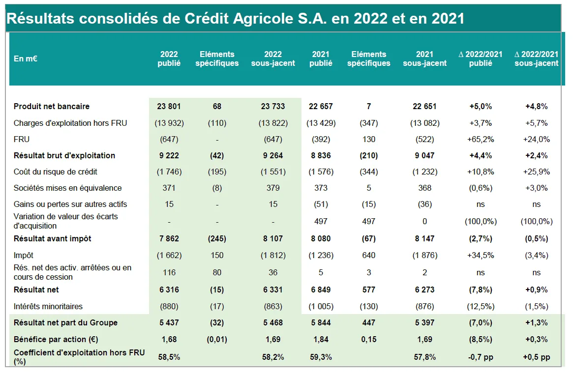 De son côté, Crédit Agricole SA, cotée en bourse, affiche des bénéfices nets en baisse, mais plus modérée. Le bénéfice par action sous-jacent de Crédit Agricole S.A. atteint 1,68 euro par action en 2022, en baisse d’un centime par rapport à 2021. Ainsi, sur l’année 2022, le résultat net part du Groupe publié est de 5 437 millions d’euros, contre 5 844 millions d’euros sur l’année 2021, soit une baisse de -7,0%. Les éléments spécifiques pour l’année 2022 ont un effet négatif de -32 millions d’euros sur le résultat net part du Groupe publié. S’ajoutant aux éléments du quatrième trimestre déjà mentionnés supra, les éléments des neuf premiers mois 2022 ont un effet négatif de -57 millions d’euros sur le résultat net part du Groupe publié et comprennent les éléments de volatilité comptable récurrents, à savoir le DVA, FVA et secured lending pour +4 millions d’euros, les couvertures de portefeuilles de prêts en Grandes clientèles pour +43 millions d’euros. A cela s’ajoutent la provision pour risques de fonds propres Ukraine pour -195 millions d’euros, la plus-value de cession de La Médicale pour +101 millions d’euros, les variations de la provision Epargne Logement pour +63 millions d’euros, les coûts d’intégration de Lyxor et de Creval pour -46 millions d’euros, la provision exceptionnelle sur les moratoires en Pologne pour -17 millions d’euros, ainsi que le déclassement du Crédit du Maroc en actifs en cours de cession pour -10 millions d’euros.