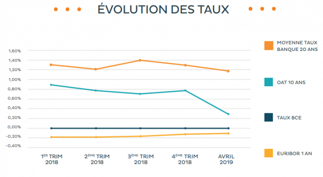 2019 ne fait pas exception. Cafpi a négocié pour ce mois d’avril jusqu’à 0,65% sur 10 ans, 0,90% sur 15 ans, 1,10% sur 20 ans et 1,20% sur 25 ans. « On frôle les records historiques d’octobre 2016, où les taux les plus bas s’établissaient à 0,65% sur 10 ans, 0,90% sur 15 ans, 1,00% sur 20 ans et 1,25% sur 25 ans », ajoute-t-il. En effet, les obligations d’Etat (OAT 10 ans) sont en chute libre, passant sur la fin du mois de 0,36% à 0,29%, conduisant à une conjoncture favorable au crédit immobilier.