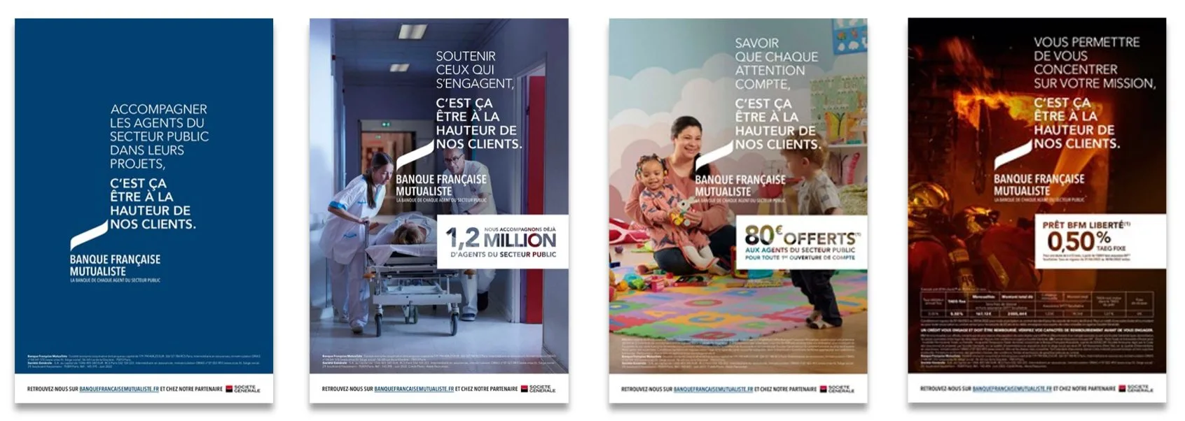 Société Générale, son partenaire depuis l’origine, relaie la campagne dans l’ensemble de ses 1 800 agences via un dispositif d’affichage extérieur et ses écrans digitaux en interne. Virginie Diallo, Directrice de la Communication de la Banque Française Mutualiste, précise : «  Avec cette campagne, après avoir capitalisé sur notre connaissance intime des agents du secteur public, nous allons plus loin en montrant le quotidien de leur métier. Cette plateforme créative réconcilie à la fois la relation de proximité que nous entretenons avec les agents du secteur public, nos valeurs fondatrices de solidarité et de respect de la personne et notre offre adaptée à leur statut. Notre nouvelle promesse de marque est très forte et impliquante, à l’image de la spécificité des agents du secteur public ; c’est pour ça que nous devons être à la hauteur de nos clients  ».