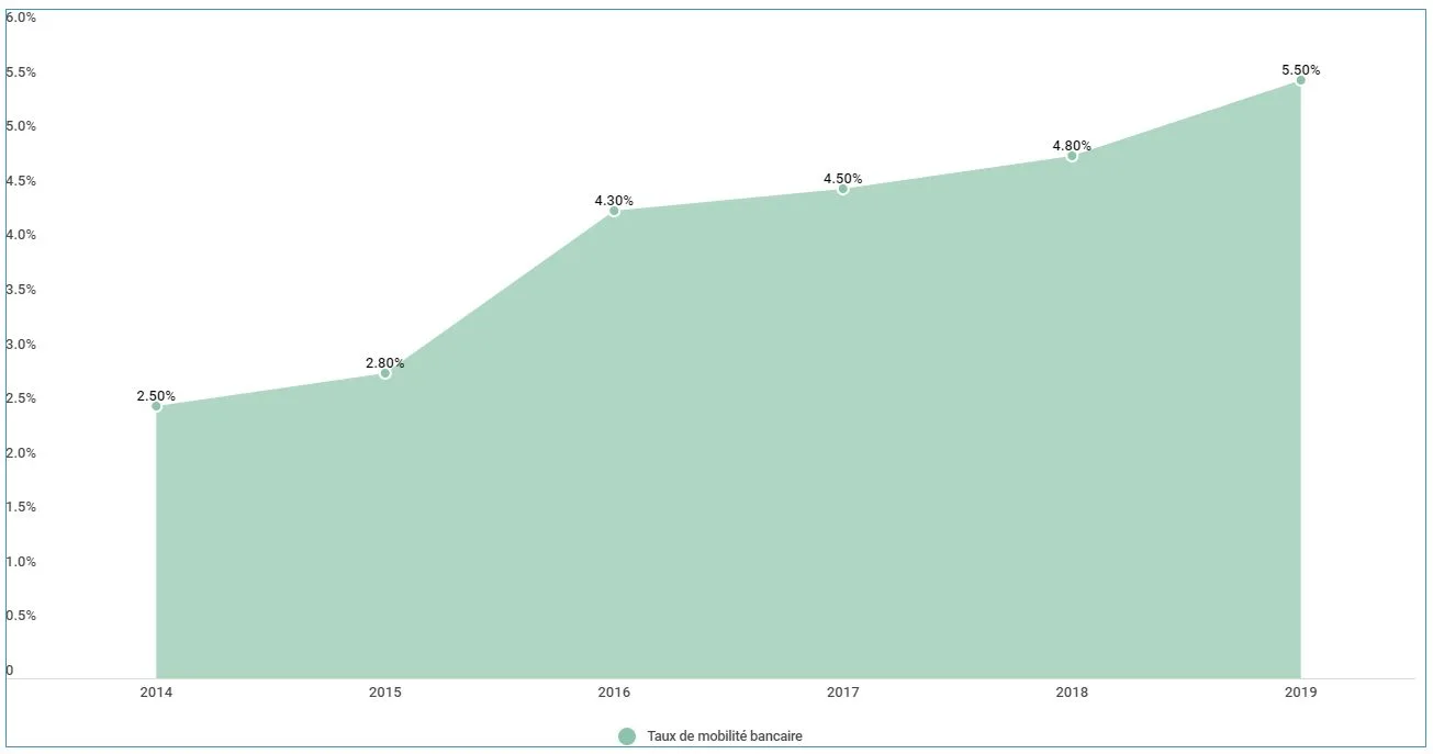 Le taux de mobilité bancaire est définit comme le pourcentage de clients ayant quitté l’établissement qui héberge le compte servant à leurs dépenses quotidiennes (paiements par carte, versement du salaire, prélèvement des factures, etc.). Ces taux de mobilité bancaire ne sont bien sûr que des estimations, basées sur des sondages et dépendant des définitions de « changer de banque » et de « banque principale » choisies dans l’étude.