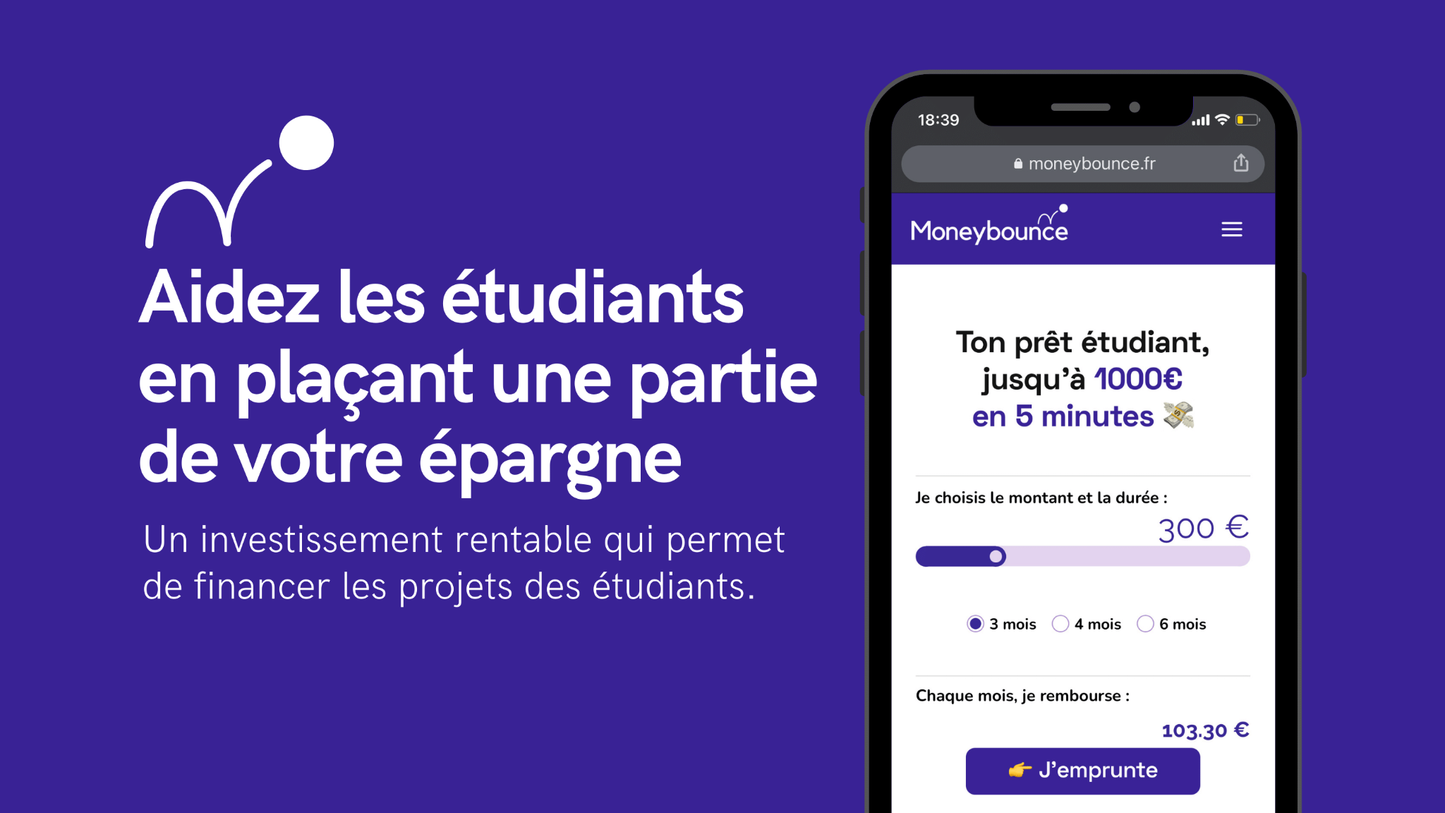 Moneybounce c’est le service de mini-crédit responsable qui permet aux étudiants de rebondir financièrement. Depuis le mois de Septembre la start-up basée à Paris a financé plus de 2000 projets étudiants avec sa solution. Pour financer leurs prêts, la fintech se base sur un réseau de prêteurs qui investissent pour donner un sens à leur épargne. Aujourd’hui la volonté de l’équipe est d’attirer plus de particuliers pour aider davantage d’étudiants. "Les étudiants font souvent face à des problèmes de financement ponctuels ! Les banques ne proposent pas de solutions pour les petits besoins d’emprunt des étudiants" déplore Alexis, CEO de Moneybounce