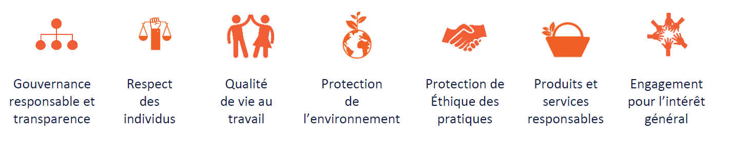 Pour obtenir le label, la CASDEN a répondu à un cahier des charges comprenant 19 principes d’action regroupés en 7 engagements qui correspondent aux questions centrales de la norme ISO 26000 :
