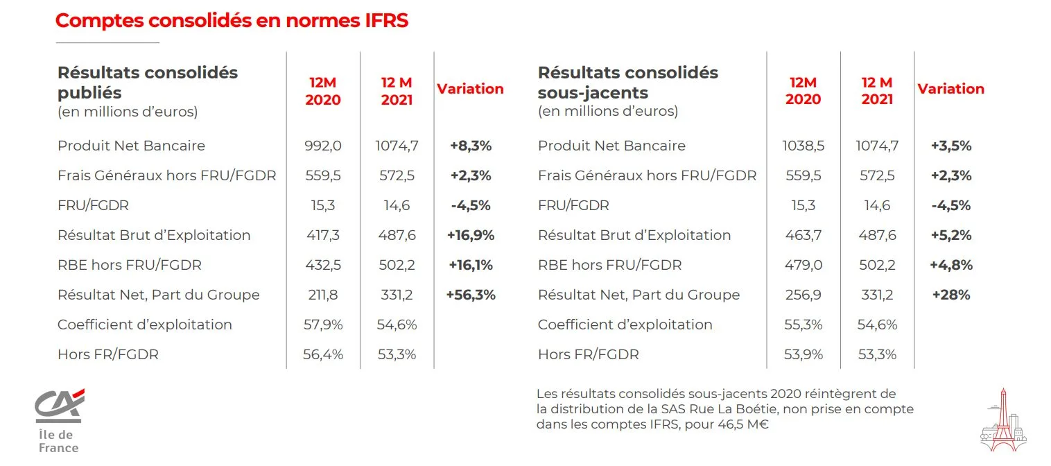 Résultats 2021 Crédit Agricole Ile de France : 331 millions d’euros de résultat net, en hausse de +56,3% par rapport à 2020
