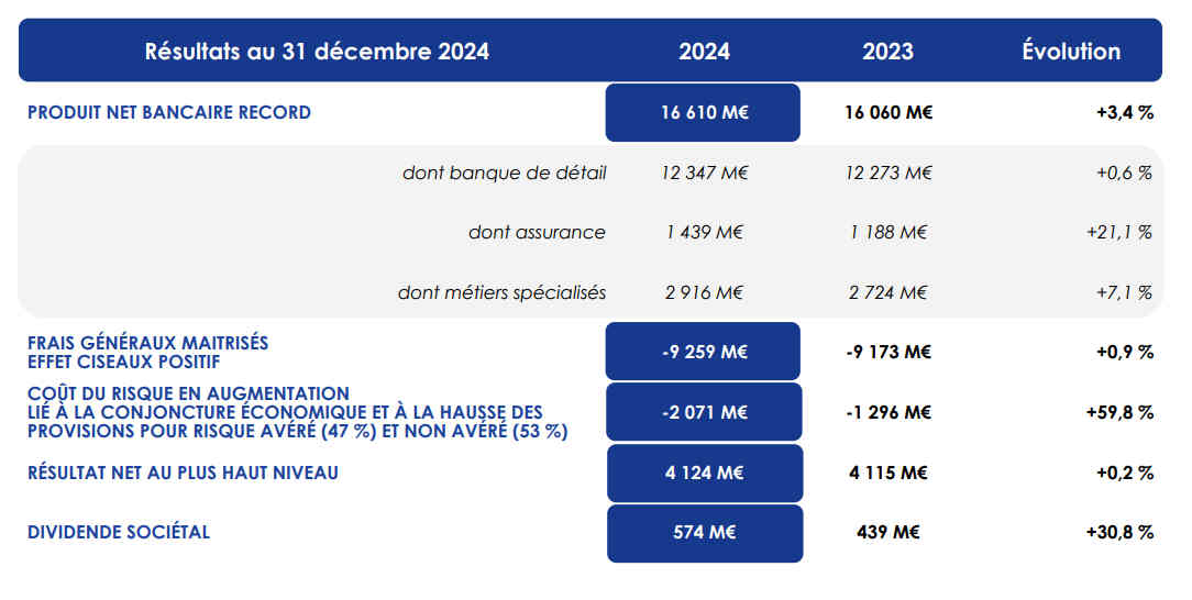Cette performance solide est réalisée dans un contexte défavorable pour la banque de détail en France. Les réseaux bancaires ont été pénalisés par la faiblesse de la demande de crédits, le rattrapage post-Covid des défaillances d’entreprises, les provisions pour risque non avéré et le pincement de la marge d’intérêt. L’assurance progresse fortement avec un résultat net contributif historique de 983 millions d’euros. Les métiers spécialisés progressent également fortement avec un résultat net de 1,1 milliard d’euros (+30,0 %).