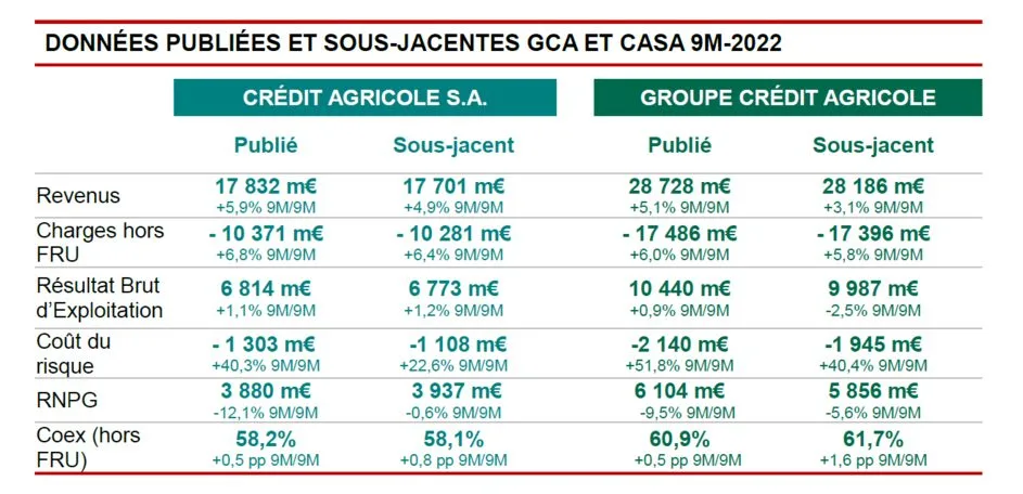 Le groupe mutualiste (à savoir Crédit Agricole SA et les 39 caisses régionales) a publié jeudi matin un résultat net de 2,004 milliards d’euros au troisième trimestre 2022. Pris seul, Crédit Agricole SA (CASA), l’entité cotée en bourse du groupe, dégage un résultat trimestriel net part du groupe de 1,352 milliard d’euros, supérieur au consensus établi par Bloomberg (1,24 milliard d’euros).
