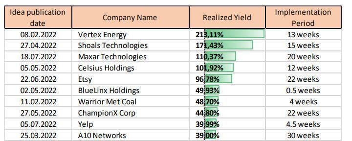 Le rendement moyen d’une idée d’investissement réalisée était de 16,2 % et le délai moyen de mise en œuvre était de 22 semaines. Les recommandations les plus rentables, avec des rendements supérieurs à 100 %, étaient Vertex Energy (213,1 %), Shoals Technologies (171,4 %) et Maxar Technologies (110,4 %). Les idées d’investissement pour Crocs Inc. (-54,6 %), Vacasa (-47,8 %) et Ammo (-44,5 %) ont affiché les rendements négatifs les plus élevés. Le rendement positif moyen sur les recommandations d’investissement était de 42,4 % et le rendement négatif moyen était de moins 21,3 %.