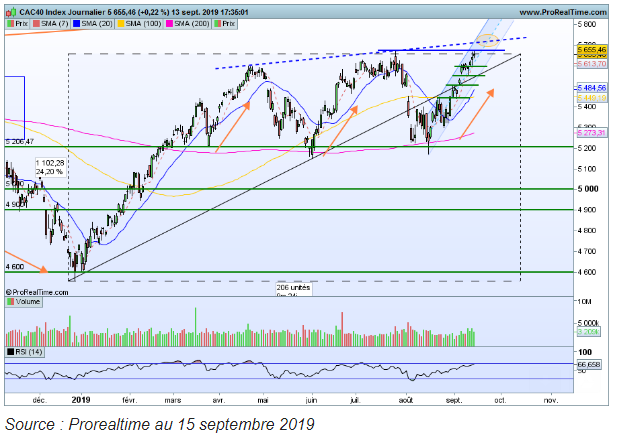 A l’instar des indices américains, le CAC40 flirte avec ses records annuels, le CAC40 dividendes réinvestis avec ses plus hauts historiques. Les acheteurs ont clairement la main depuis la mi-août mais l’ascension pourrait se compliquer, la volatilité fait son retour. Après un tel rallye l’investisseur prudent n’oubliera pas de prendre une partie de ses gains sur ses positions gagnantes et/ou de remonter ses stops de protection pour parer à un éventuel retournement de situation.
