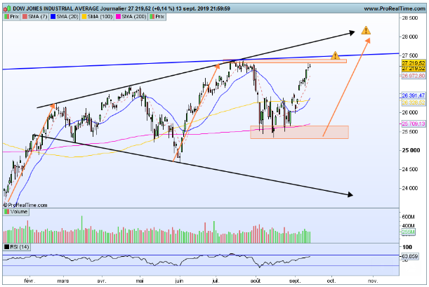 Le Dow Jones se trouve à la croisée des chemins, à quelques points de ses records historiques, le tout avant un rendez-vous capital pour les investisseurs avec la FED ce mercredi soir. La banque centrale américaine va très certainement baisser une nouvelle fois ses taux d’intérêts mais le discours associé à cette baisse sera scruté de près, épluché par les commentateurs. L’important n’est pas de savoir si baisse (de taux) il y aura mais ce qu’il en sera de la suite, des mois à venir, d’une pause qui s’installe ou d’une porte ouverte à de nouvelles mesures. Si les marchés n’ont pas dérapé d’ici là, la possibilité d’un nouveau record historique reste d’actualité.