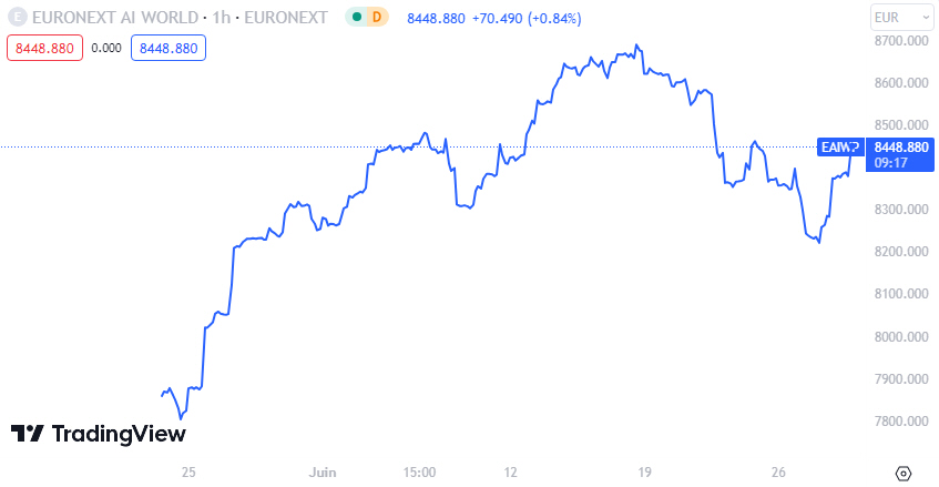 Bien évidemment, les titres les plus exposés comme Adobe, Alphabet, Broadcom, Meta, Nvidia, Oracle, TMicroelectronics, Schneider Electric, SAP, Infineon, Adyen sont bien dans l’indice Euronext AI World. Le contraire aurait été plus que surprenant.