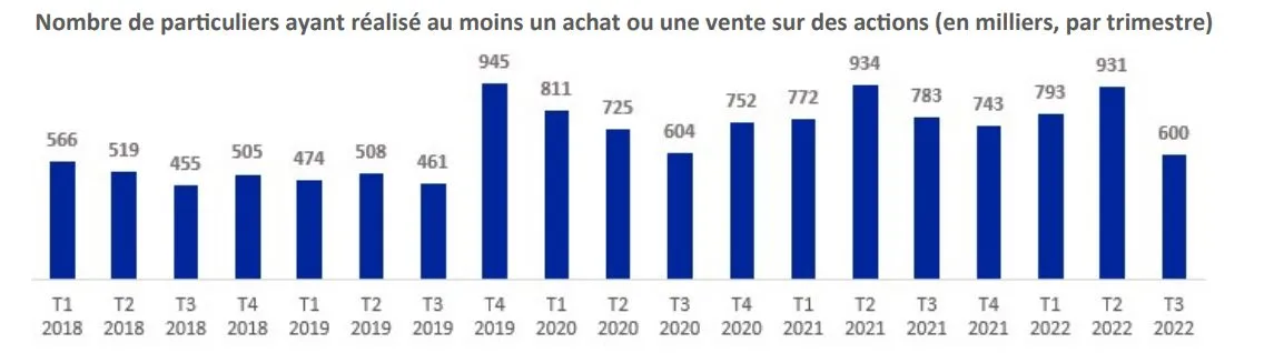 Depuis janvier 2021, l’Autorité des marchés financiers (AMF) publie tous les trois mois un tableau de bord des investisseurs particuliers actifs sur les marchés financiers au cours du trimestre précédent. Au troisième trimestre 2022, le nombre de particuliers investisseurs actifs en bourse (achats/ventes de titres) a chuté de 35%.