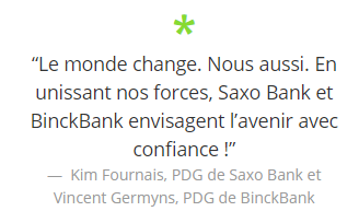 Nous avons le plaisir de vous annoncer aujourd’hui que nous unissons nos forces à celles de Saxo Bank. Cela représente une profonde opportunité de développement dans les années à venir pour BinckBank et cela signifie que nous pourrons vous offrir des services encore plus complets et qualitatifs. L’objet de cet email est de vous donner les principales informations quant à ce rapprochement.