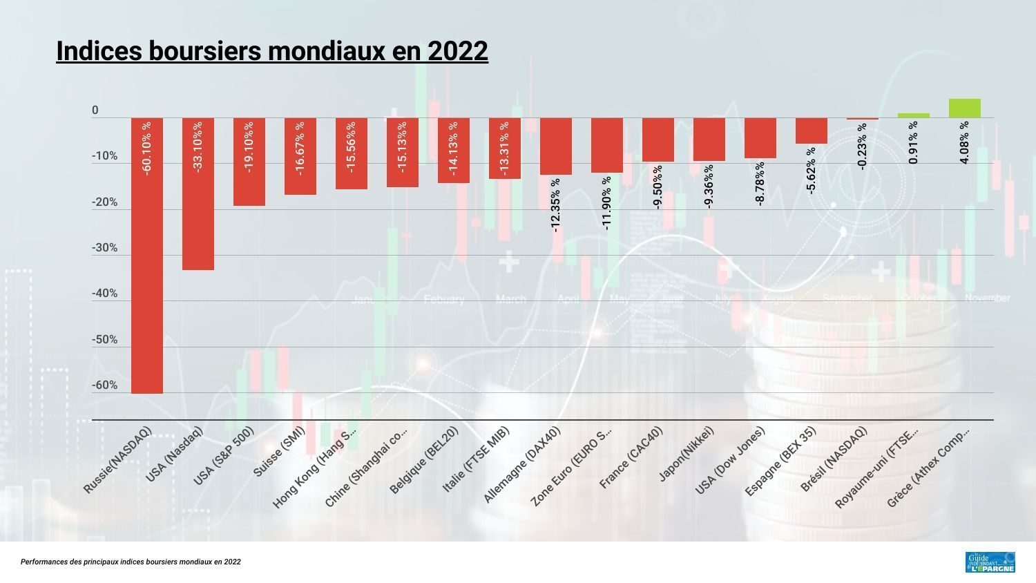 Bilan 2022 des indices boursiers des marchés actions, sans surprise la pire baisse est celle de la bourse russe (-60.10%) et la plus belle performance revient à la Grèce avec +4.08%. Le CAC40 évite le pire et termine avec une baisse de 9.50% en 2022.