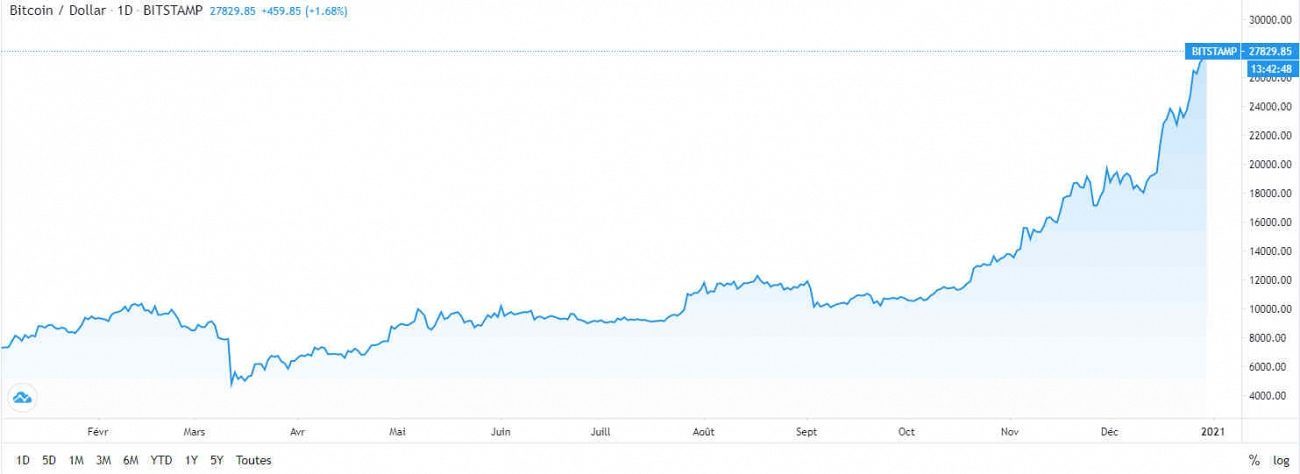 Le cours du bitcoin en dollars a enregistré un nouveau record historique ce mercredi 30 décembre à 28.579,59 dollars. En décembre, la devise a progressé de 50%, et depuis le début de l’année, la hausse s’élève à près de 300%. Loin derrière les actions de Telsa (600% de hausse en 2020), le bitcoin aura marqué les esprits des investisseurs en 2020, avec son sacrement, l’intégration du bitcoin sur la plateforme PayPal en 2021 en tant que devise de paiement.