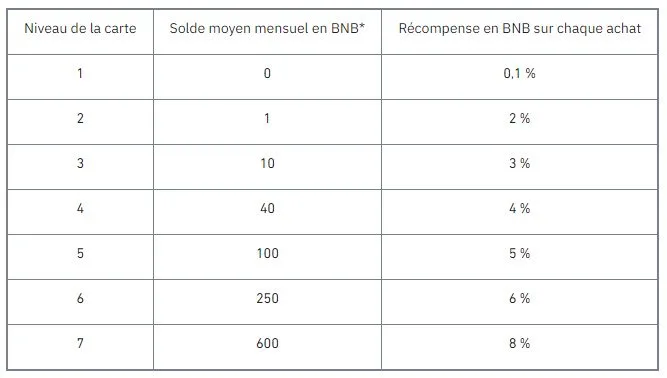 La carte Binance comporte 7 niveaux. Chaque niveau offre une récompense en pourcentage comme indiqué dans le tableau ci-dessous.