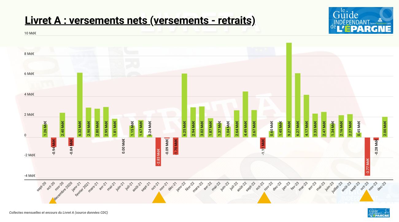 La collecte du Livret A et du livret de développement durable et solidaire au titre du mois de décembre 2023 est positive avec 3,01 milliards d’euros pour l’ensemble des réseaux. Sur l’ensemble de l’année, elle s’élève en cumulé à +39,91 milliards d’euros.