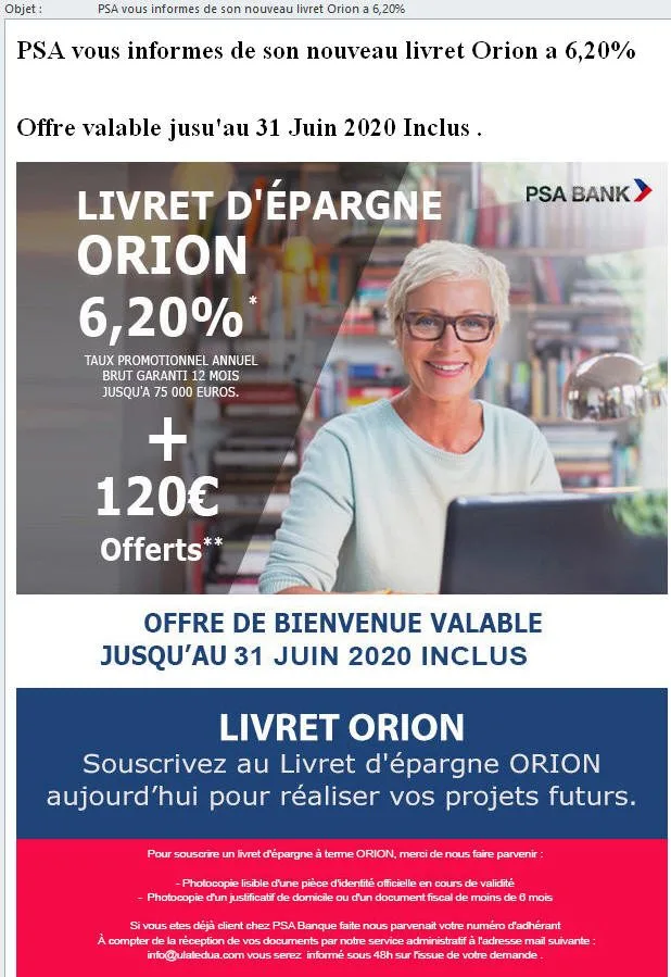 Vous avez reçu un courriel vous proposant un livret épargne ORION, proposant un taux de 6.20% pendant 12 mois, faisant croire que cette offre émane de PSA BANK, avec une prime de 120 euros à la clé, c’est une ARNAQUE !