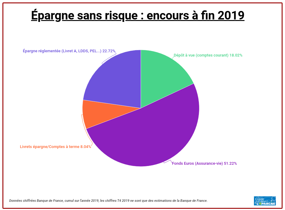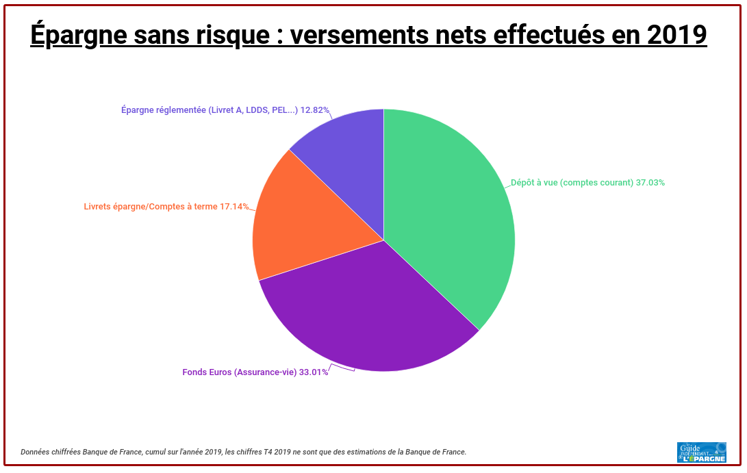 Selon les chiffres de la Banque de France, encore provisoires et partiels pour le T4 2019, les Français auraient épargné près de 140 milliards d’euros. La large majorité des placements effectués porte sur des produits d’épargne sans risque, fonds euros en tête, devant les livrets épargne et comptes à terme, puis l’épargne réglementée.