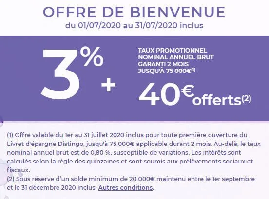 Prime de 40€ offerte pour toute première ouverture d’un livret DISTINGO entre le 1er et le 31 juillet 2020 inclus. La prime sera versée le 15 janvier 2021, sous réserve que le Livret soit toujours ouvert à cette date et que les avoirs totaux du titulaire (Livret et compte(s) à terme éventuel(s)) aient été en permanence de 20 000€ minimum entre le 1er septembre et le 31 décembre 2020 inclus.