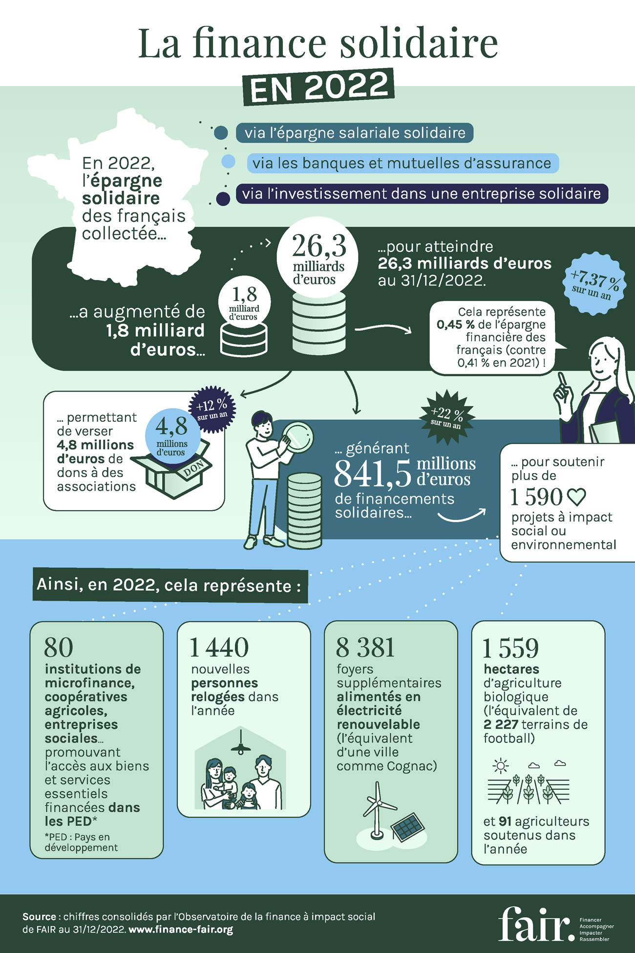 Le Baromètre de la finance solidaire FAIR / La Croix : Issu de la consolidation des données collectées par l’Observatoire de la finance à impact social, ce document annuel de 8 pages, réalisé en partenariat avec le quotidien La Croix, dévoile les dernières évolutions et tendances du secteur de la finance solidaire en France. Il invite également le lecteur à découvrir tous les produits labellisés Finansol et comment devenir épargnant solidaire. Les données proviennent de FAIR, de l’AFG pour l’épargne salariale solidaire, de la Banque de France pour le patrimoine des Français et de France Assureurs.