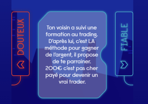 Grâce à des vidéos, jeux, BD, infographies, etc., il pourra tester et améliorer ses connaissances financières, découvrir son profil d’investisseur, renforcer sa capacité à prendre des décisions éclairées, mettre fin à certaines idées reçues et se confronter à des arnaques.