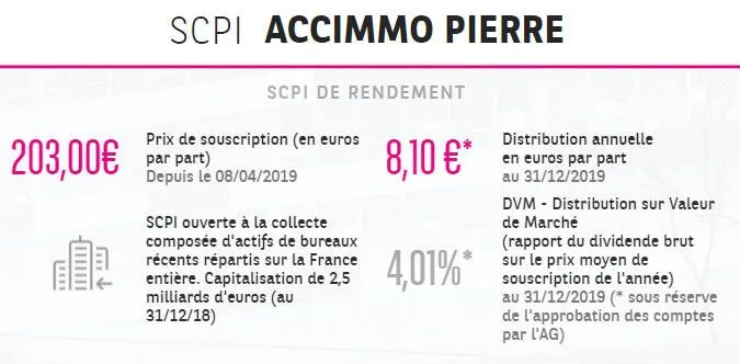 Parmi les cinq plus importantes SCPI françaises en termes de capitalisation, approchant le seuil des 3 milliards d’euros, Accimmo Pierre est une SCPI historique dont le patrimoine est composé de 81 immeubles situés dans les plus grands marchés nationaux (Paris et régions). Accessible à partir de 203 €, elle a déjà attiré plus de 53 000 investisseurs particuliers et affiche un rendement de 4,01% sur 2019.