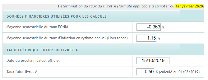 Nouvelle formule officielle de calcul du taux du livret A applicable à partir du 1er février 2020