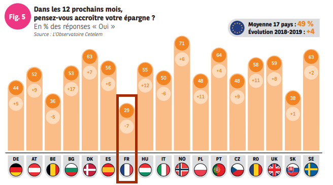 Une inquiétude plus forte devrait être synonyme d’une forte poussée de l’épargne, afin de se prémunir contre des jours plus difficile. Le taux d’épargne des Français restait stable à la fin 2018, à un haut niveau en Europe, à 14.06% (chiffres Banque de France), et ce, malgré la forte chute des marchés financiers en fin d’année. Et bien, toujours selon l’étude, il n’en est rien, puisque les Français, champions du pessimisme serait les plus enclins à réduire leur effort d’épargne. Allez comprendre.