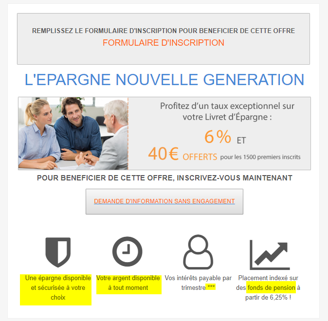 Une proposition reçue par courriel faisant état d’une proposition de livret épargne à 6% NET. Voici une copie d’écran du courriel reçu (nous avons surligné en jaune les points qui doivent susciter l’interrogation de l’épargnant).