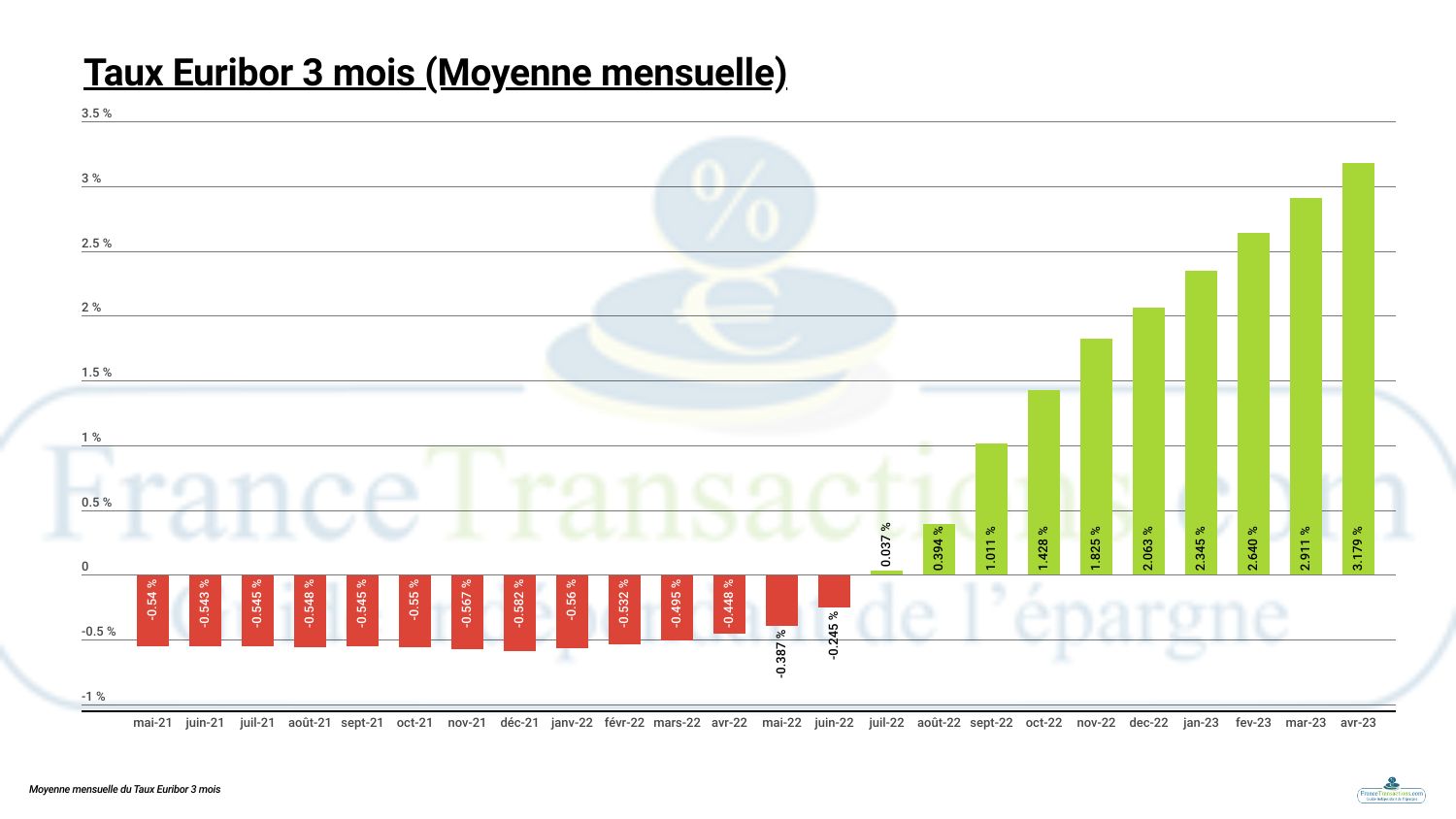 La hausse des taux d’intérêts monétaires (inférieurs à 12 mois), et notamment de l’EURIBOR 3 mois, indice de référence de nombreux placements monétaires dépasse désormais les 3% depuis avril dernier. Les placements de taux d’intérêts vont donc voir leur rendement grimper dans les semaines à venir. D’ailleurs, les rendements des sicav monétaires sont en forte hausse depuis quelques semaines déjà.