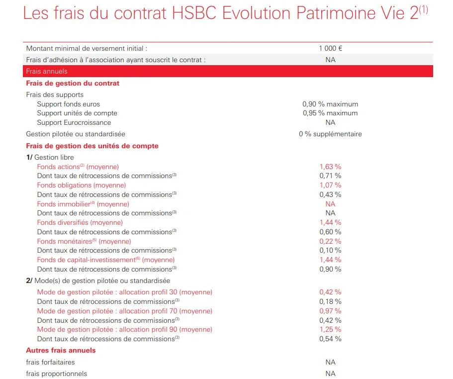 Voici les copies d’écran de la présentation réglementaire des frais du contrat d’assurance-vie HSBC Evolution Patrimoine Vie 2. Si les épargnants trouvent cela plus complets, c’est évident, ce n’est pas pour autant plus clair. La cascade de frais précisés pour les unités de compte ne dépend pas véritablement du contrat, mais de l’ensemble des unités de compte éligibles à ce contrat. C’est donc une nouvelle fois davantage de questions que de réponses qui seront apportées aux épargnants.