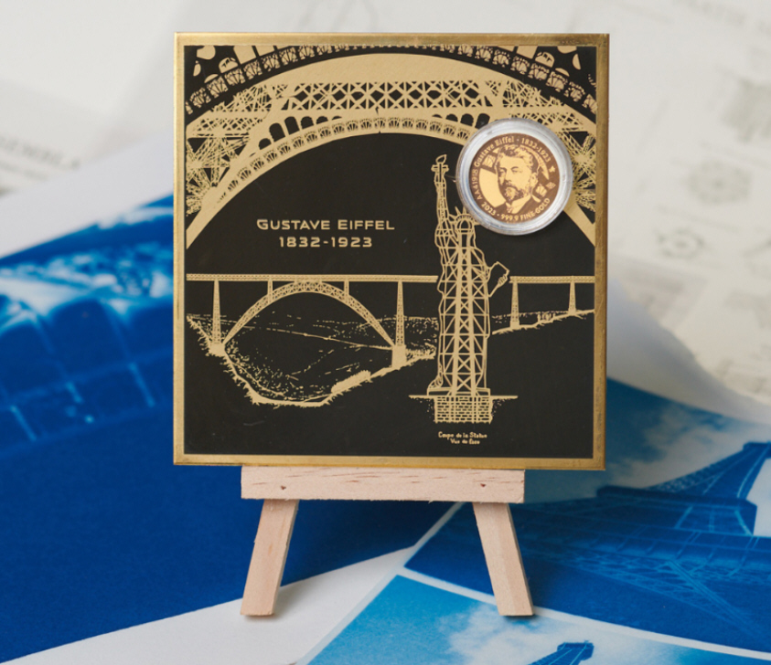 La pièce d’or Gustave Eiffel est intégrée dans un coffret premium qui se compose d’une plaque en laiton gravée des plus belles créations de l’ingénieur, accompagnée d’une Vera Black d’1/10ème d’once et d’un cyanotype de la Tour Eiffel édité par un photographe professionnel. Une édition ultra-limitée, à 100 exemplaires, disponible jusqu’au 31 décembre 2023 uniquement.