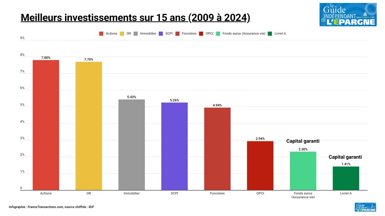 Sur un horizon de 15 ans, actualisé à avril 2025, cette fois-ci, c’est bien l’or qui prend la première place, devant les actions. Mais en se bornant à l’image des investissements à fin 2024, les actions figurent toujours devant l’or, en terme de rendement annualisé.