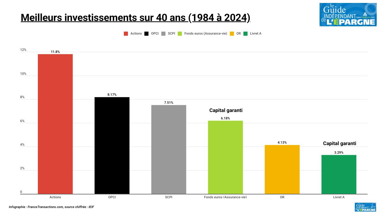Sur longue période sur 40 ans (1984-2024) : sur très longue période, les actions sont les placements les plus performants. L’immobilier présente sur 40 ans des performances comprises entre 7,5 et 10 %. Le TRI des Logements à Paris est supérieur à 10 %. L’immobilier non coté délivre des performances supérieures à celles de l’assurance-vie.