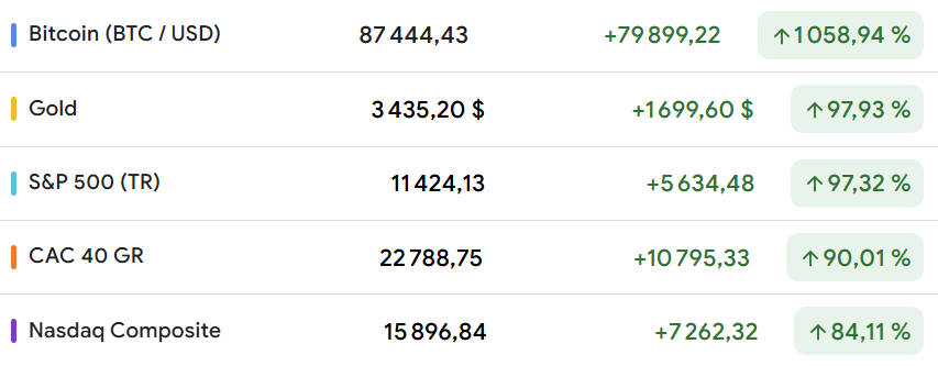 Paradoxe de la situation, les placements les plus rentables ne servent ni intérêt, ni rendement, ni loyer, ni dividende ! La note suivante rappelle que ce genre de classement des investissements les plus performants sur ces dernières décennies permet de faire de l’audience, mais ne présente aucun réel intérêt. Le passé appartenant au passé, il ne présage en rien de l’avenir. Le chamboulement du début d’année 2025 montre bien qu’une situation peut évoluer rapidement.