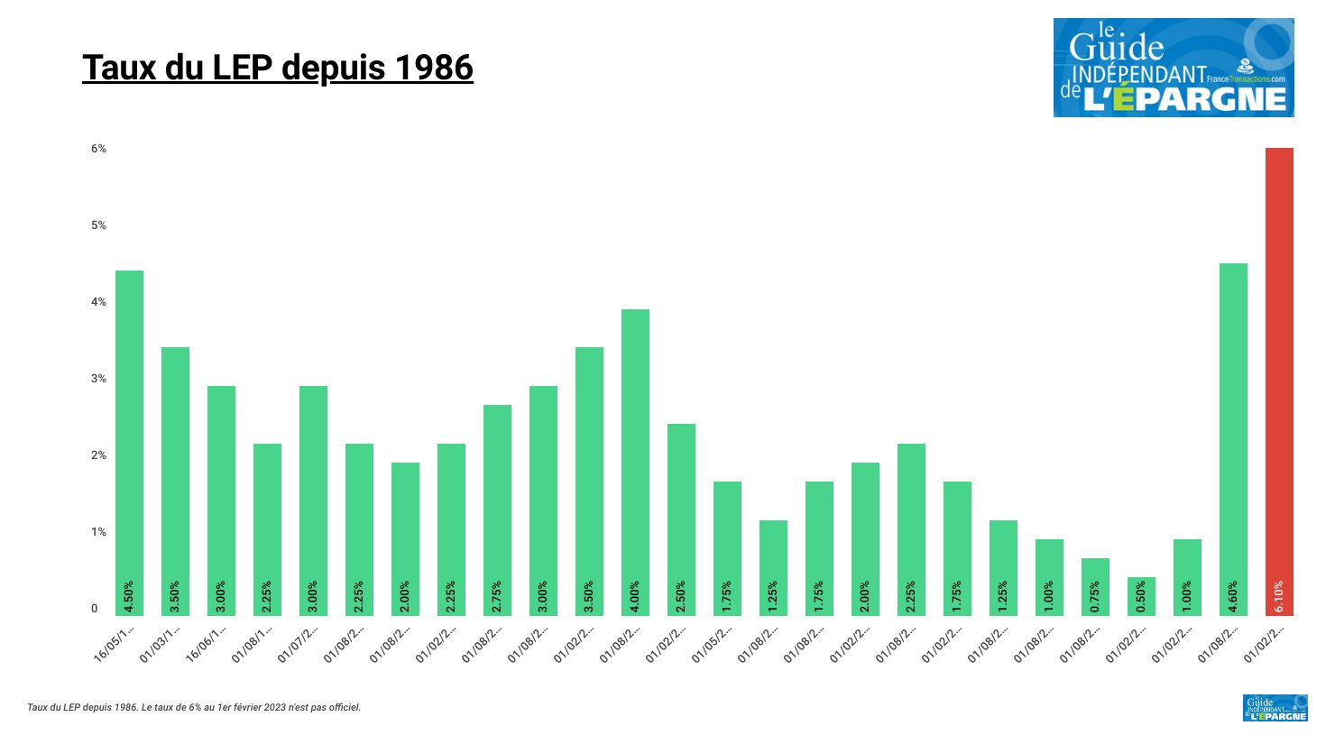 Le taux du LEP grimpe, au 1er février 2023, à un niveau historique, de 6.1% (4.6% depuis le 1er août dernier). L’application de la formule officielle du calcul du taux du LEP donne un résultat de 2,00% à ce jour (4 décembre 2025). Mais sachant que la moyenne de l’inflation prise en compte est sur une pente ascendante, le taux de 6.1% net pour le LEP au 1er février 2023 est d’ores et déjà acquis.