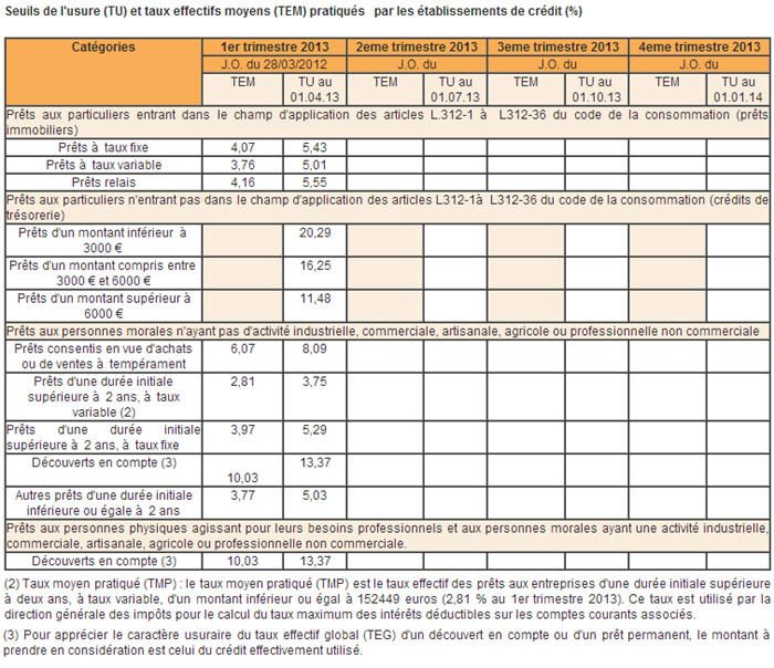 Chaque trimestre, la Banque de France relève auprès des établissements financiers, les taux effectifs moyens (TEM) de 11 catégories de financement octroyés aux entreprises et aux particuliers qui permettront de déterminer les taux de l’usure (taux moyen augmenté d’un tiers).