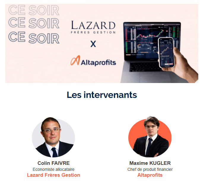 Session en direct le jeudi 17 avril de 18h à 18h30, avec Colin Faivre, économiste allocataire chez Lazard Frères Gestion et Maxime Kugler, chef de produit financier chez Altaprofits.