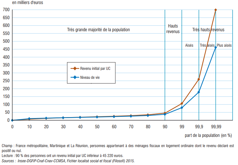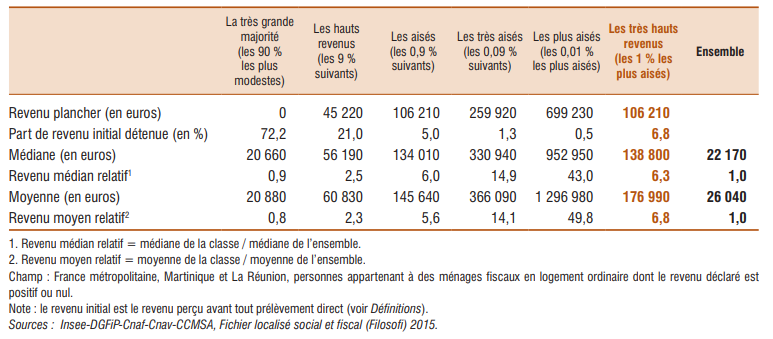 En 2015, au‑dessus de 106 210 euros de revenu, une personne se situe parmi les 1 % les plus aisés de la population, c’est‑à‑dire les très hauts revenus. Ces derniers gagnent en moyenne près de sept fois plus que l’ensemble de la population et perçoivent 6,8 % de la masse des revenus.