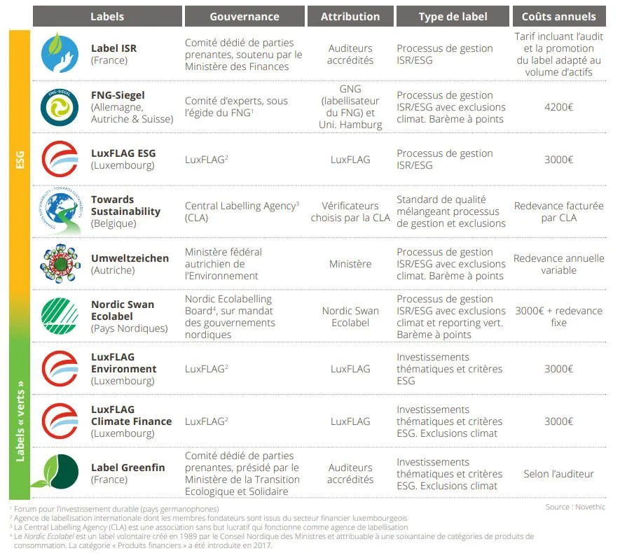Certains labels émanent de places financières, d’autres d’associations professionnelles dédiées à la finance durable ou d’organisations spécialistes de la labellisation environnementale de tous types de produits. La France est le seul pays où le gouvernement a créé et porte deux labels publics : le label ISR pour les fonds se réclamant de l’investissement socialement responsable (ISR), acronyme toujours utilisé en France, et le label Greenfin pour les fonds environnementaux.