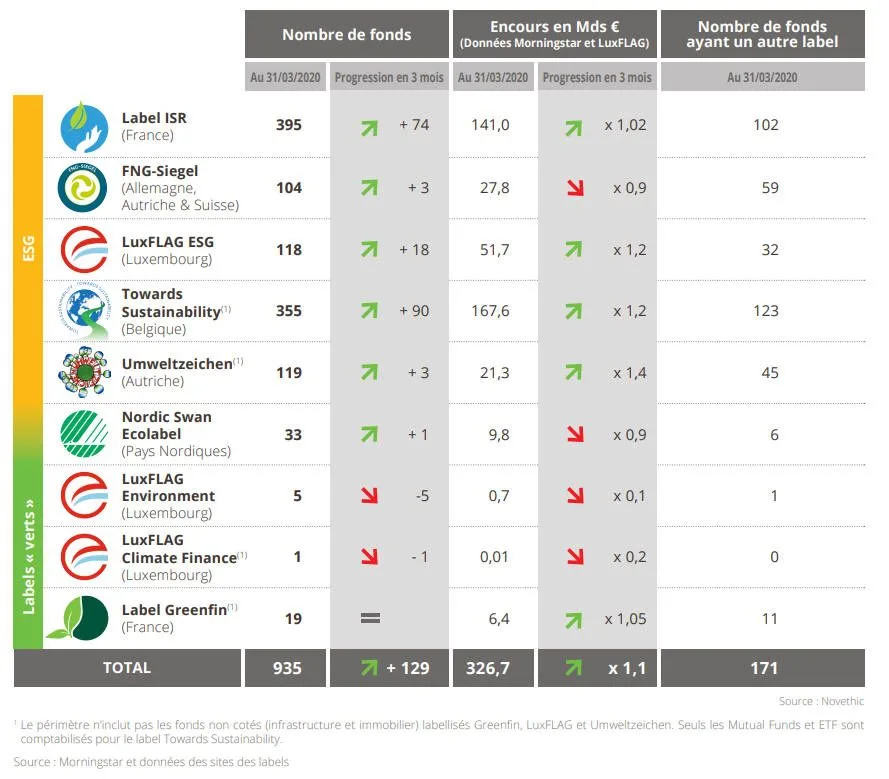 Près de 1.000 fonds finance durable, selon 9 labels différents. De quoi s’y perdre, ou plutôt sans doute de quoi douter du bien fondé de ces labels. Pour aider les investisseurs à se repérer, une dizaine de labels européens ont été créés ces quinze dernières années. Avec 935 fonds labellisés et plus de 326 milliards d’euros d’encours à la fin du premier trimestre, le marché a fait un nouveau bond en 2020. Le label ISR français et le standard belge Towards Sustainability, dernier arrivé dans le paysage des labels européens de finance durable, constituent toujours le duo de tête, chacun dépassant les 300 fonds labellisés et les 100 milliards d’euros d’encours. A la fin du premier trimestre, le label ISR occupe la première place en nombre de fonds (395 contre 355) mais il est devancé par Towards Sustainability en volume d’encours (141 milliards contre 168 milliards d’euros).