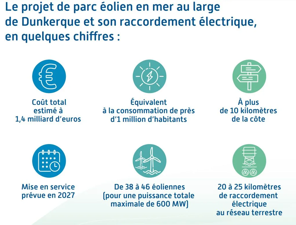 En 2027 devrait être opérationnel le parc éolien en mer au large (10km) de Dunkerque. 26 éoliennes capables de délivrer de l’électricité pour près d’un million d’habitants. Le lancement officiel du chantier sera effectué le lundi 10 mai 2021.