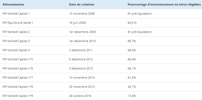 Le FIP Kallisté Capital n°2, agréé par l’AMF le 19 septembre 2009, a permis de bénéficier d’une réduction d’impôt sur le revenu de 50 % du montant de la souscription. La dernière valeur liquidative du fonds, au 30 novembre 2017 était de 111,09 € par part A, soit une performance de + 11 % hors avantage fiscal et + 61 % avec avantage fiscal. Un remboursement partiel de 60 € par part A sera effectué avant le 30 juin 2018. Le solde sera remboursé au cours des 18 prochains mois.