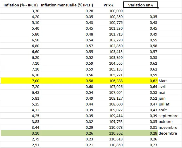 Ainsi, avec un taux d’inflation de 7% en février (IPCH), si la division par 2 devient réalité, l’inflation serait attendue, en rythme annuel à 3.5%. La hausse des prix serait donc 2 fois moins élevée chaque mois. La hausse en euros resterait sensiblement élevée.