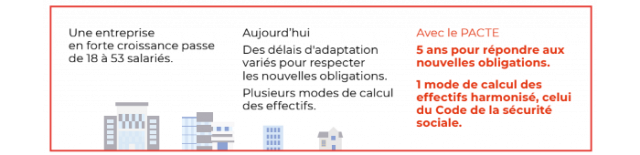 Les obligations liées aux seuils seront considérablement allégées et simplifiées afin de créer un nouvel environnement juridique plus favorable à la croissance des PME. Des seuils regroupés sur les niveaux de 11, 50 et 250 salariés. Le seuil de 20 salariés sera supprimé à l’exception du seuil d’obligation d’emploi des travailleurs handicapés (OETH). Les seuils de 10, 25, 100, 150, 200 salariés seront également supprimés.