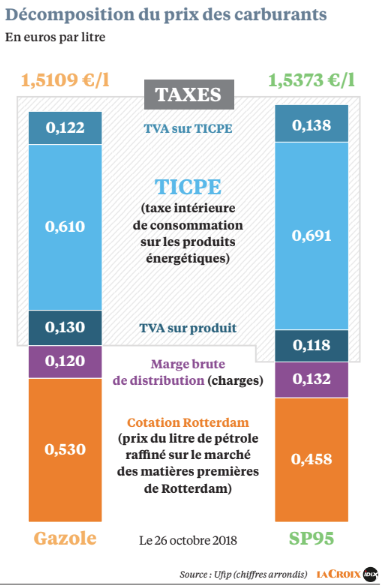 Le prix des produits eux-mêmes, cotés sur le marché européen de Rotterdam, représentent actuellement environ 30% à 35% du prix payé à la pompe, et la marge brute des distributeurs compte pour environ 8%.