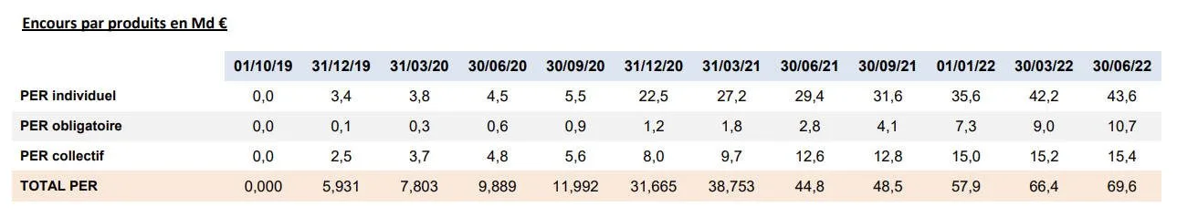Les encours constitués sur ces PER atteignent presque 70 milliards d’euros, dépassant largement l’objectif initial de 50 milliards pour fin 2022. Cette dynamique concerne tant les PER d’entreprise, collectif (10,7 Mds d’euros d’encours) et obligatoire (15,7 Mds d’euros d’encours), que les PER individuels (43,6 Mds d’euros d’encours).