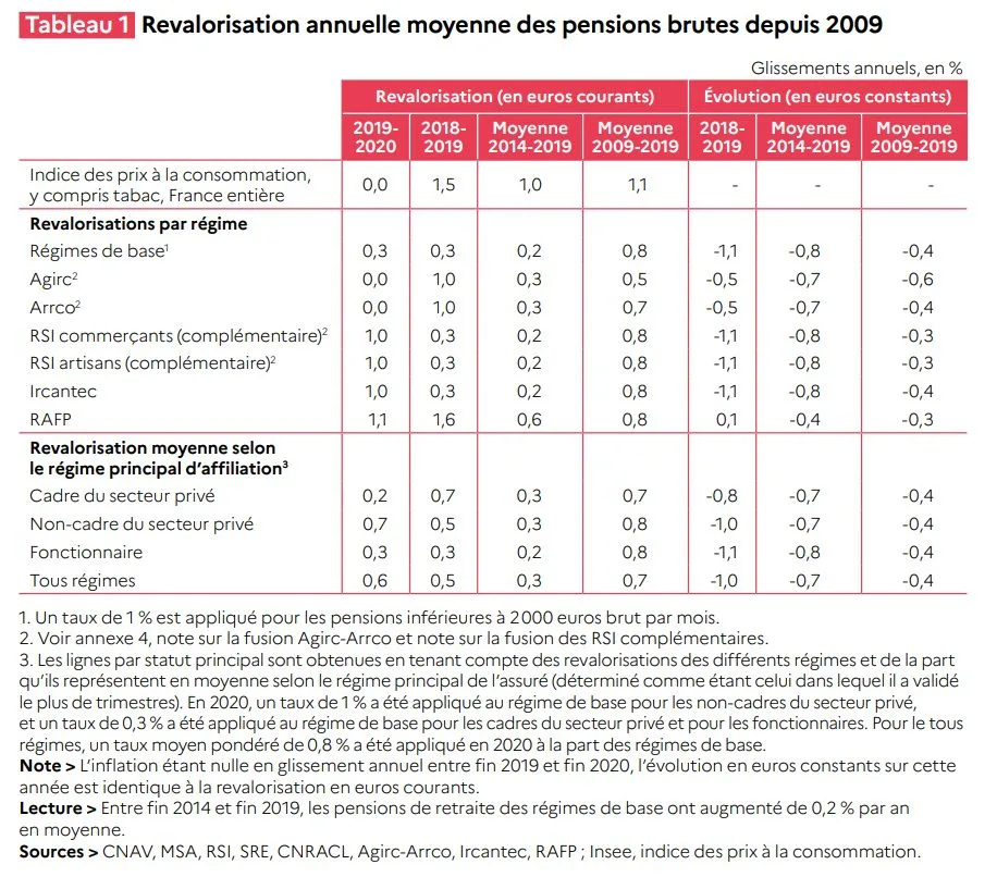 Pour 2020, les pensions tous régimes inférieures à 2.000 euros bruts par mois ont été revalorisées de 1,0 % au 1er janvier, tandis que les pensions supérieures ne l’ont été que de 0,3 %. Depuis 1994, le pouvoir d’achat résultant des pensions nettes des retraités anciennement salariés du secteur privé a diminué, notamment en raison de la hausse des prélèvements sociaux sur ces pensions.